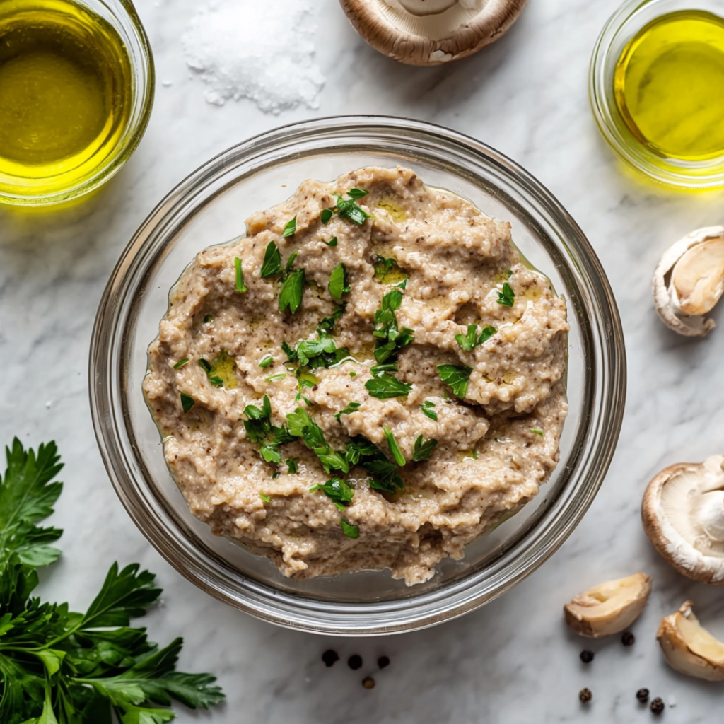 Подготовьте все необходимые ингредиенты Грибы отварите до готовности примерно 10–15 минут. Измельчить блендером. Петрушку мелко нарубить. В сковороде разогреть масло на среднем огне. Измельчить лук и обжаривать около 5–7 минут. Добавить шампиньоны, петрушку, лимонный сок, соль и перец. Перемешать, переложить в банку и закрыть крышкой.