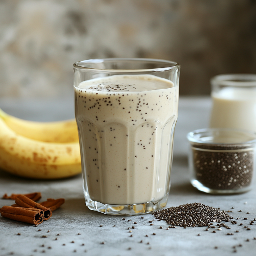 Банан 1 шт; Овсяного молоко 250мл; Семена чиа 1 ст.л; Корица — по вкусу.