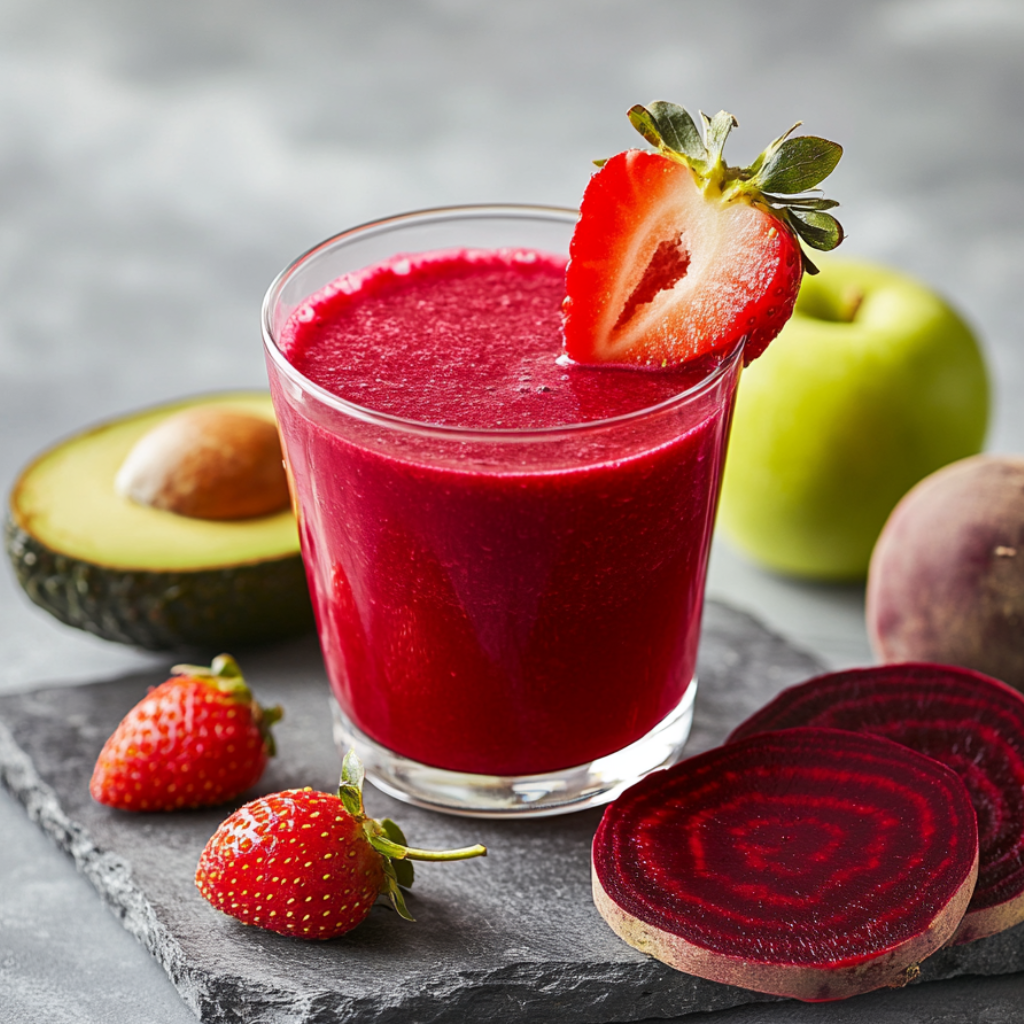 Яблоко 1шт; Свекла 1/2шт; Клубника 250г; Авокадо 1/2шт; Лимонный сок 1 ст.л; Холодная вода 125мл.