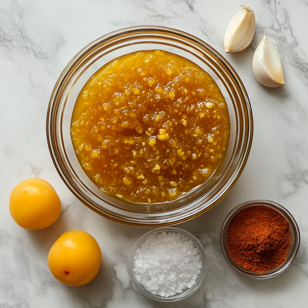 Алыча (желтая) 1кг; Хмели-сунели по вкусу; Перец острый молотый по вкусу; Поваренная соль 1ст.л; Сахар(по вкусу, но не менее 3 ст.л.); Чеснок 3 зубч.