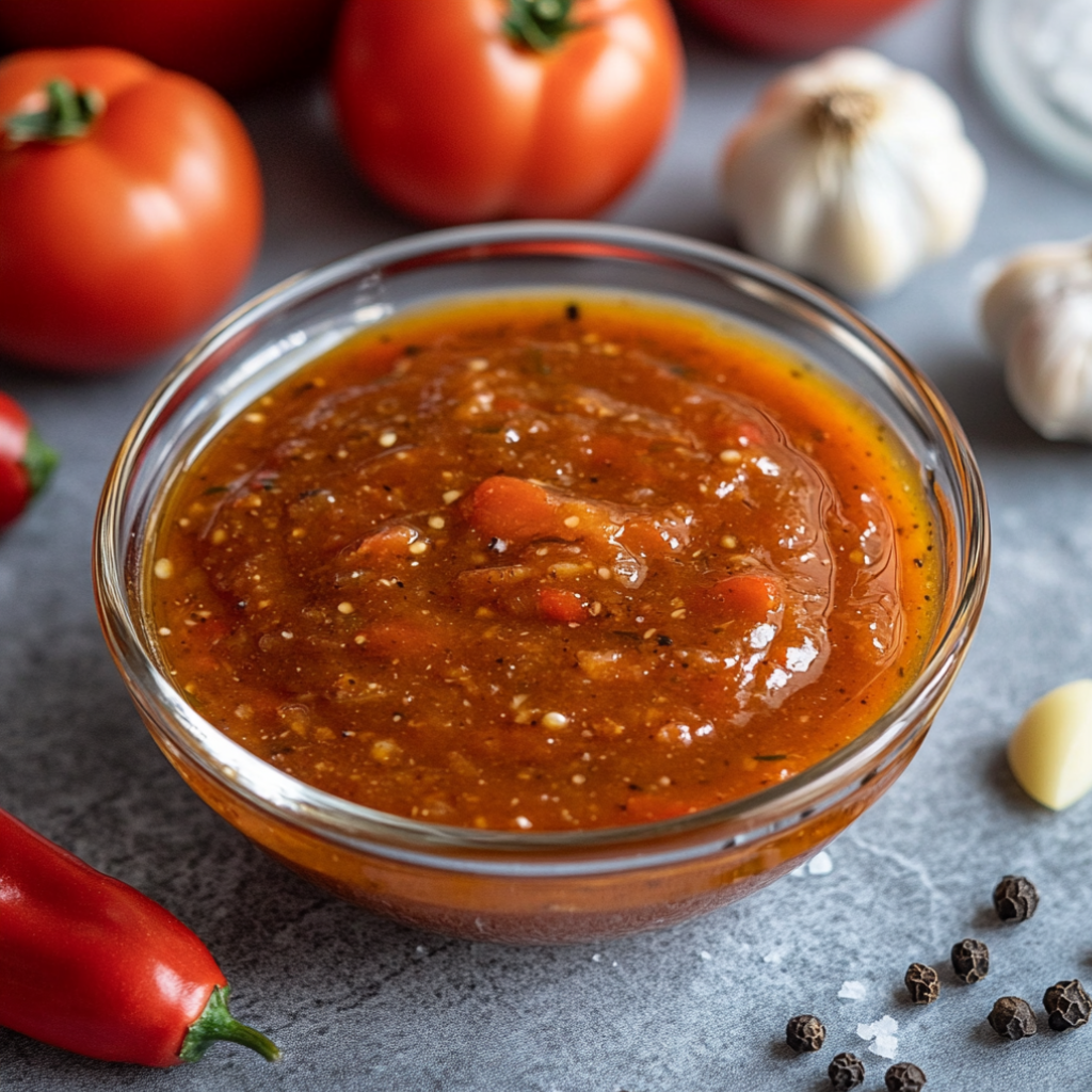 Помидоры 1,25кг; Болгарский перец 125гр; Лук репчатый 50гр.; Чеснок 50гр; Поваренная соль 0,4 ст.л; Сахар 100гр; Растительное масло 38мл; Уксус 38мл; Перец молотый 0,3 ч.л;