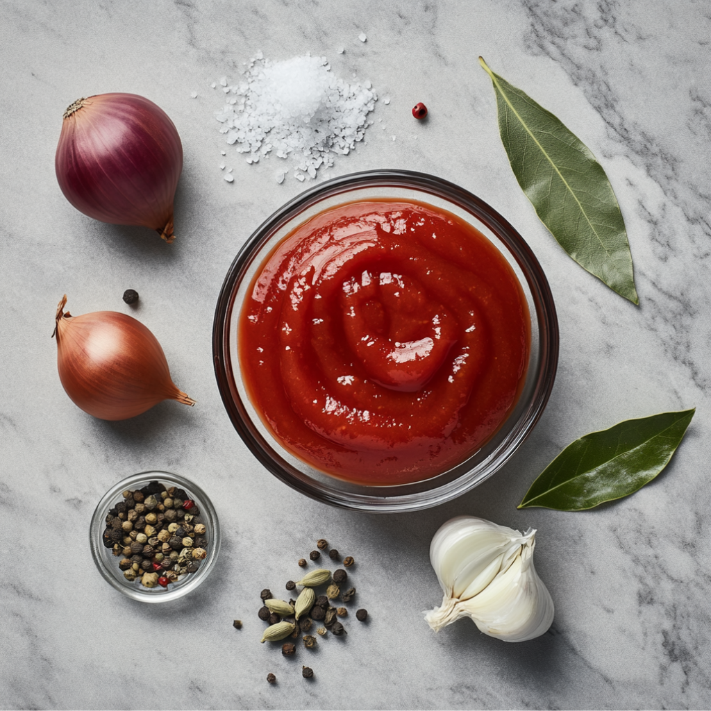 Подготовьте все необходимые ингредиенты Томатную пасту выбирайте качественную. От неё будет зависеть общий вкус соуса. Репчатый лук и чеснок очистите от шелухи. Нарежьте крупными кусочками лук. Переложите всё в чашу измельчителя. Эти ингредиенты теперь необходимо измельчить до максимально однородной консистенции, можно сказать в пюре. По желанию на этом этапе можно добавить измельчённую свежую зелень. Томатную пасту и луково-чесночное пюре переложите в подходящую по размеру кастрюлю или сотейник с толстыми стенками и залейте фильтрованной водой. Перемешайте и поставьте на средний огонь. Лук, измельченный в пюре, за время варки совершенно перестанет чувствоваться в готовом кетчупе. Когда томатная масса закипит, добавьте соль и сахар-песок. Добавьте приправы: лавровый лист, душистый перец и гвоздику. Запомните количество горошин, которые вы добавили, потому что в конце приготовления их все придется удалить, чтобы специи не попались в готовом кетчупе. Следующим шагом добавте паприку. Ориентируйтесь на свой вкус. Паприка придаст готовому кетчупу приятный привкус. Тщательно перемешайте все ингредиенты и убавьте огонь до минимального. После закипания кетчуп должен вариться около получаса. Периодически перемешивайте соус, чтобы он не пригорел. Как только кетчуп достаточно загустеет, и вас удовлетворит его консистенция, советую попробовать его, чтобы понять, всего ли в нём достаточно, или есть необходимость в досоле, например. Если всё устраивает, снимайте его с огня. Шумовкой удалите все приправы, они больше не понадобятся. Кетчуп из томатной пасты в домашних условиях готов.