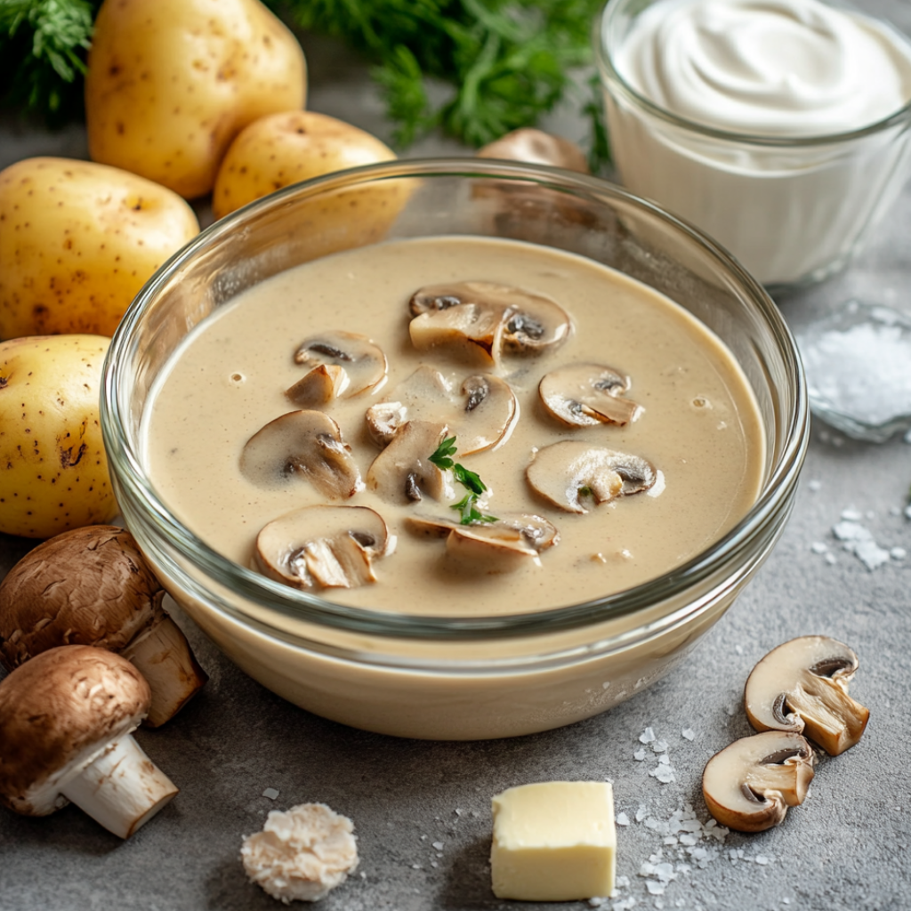 Картофель 1кг; Шампиньоны 300г; Луковица 1шт; Сливки жирностью 20% 200мл; Сливочное масло 20г; Соль 4г.