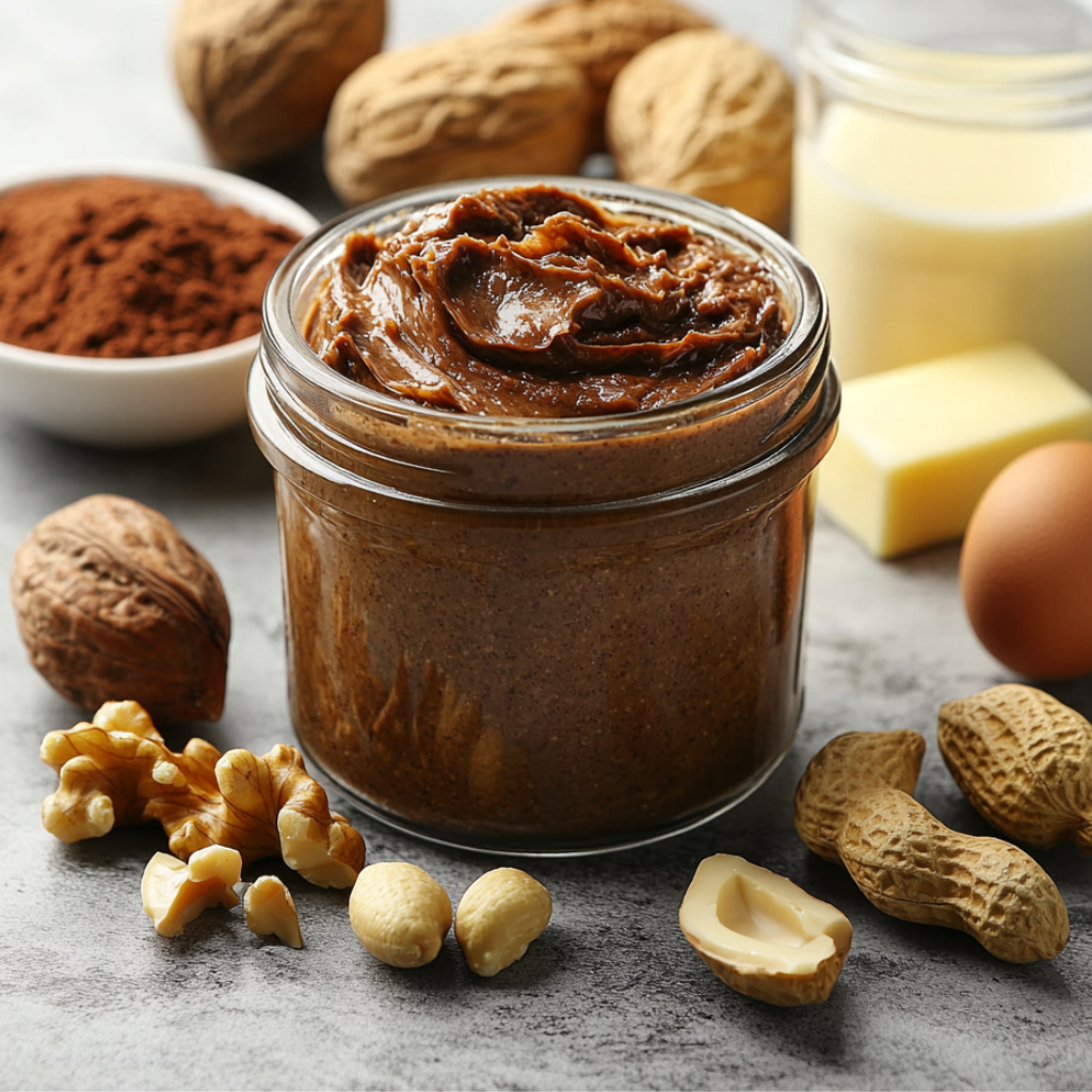 Подготовьте все необходимые ингредиенты Яйца комнатной температуры и сахар, взбить с помощью блендера используя венчик. Когда сахар растворится, постепенно добавить муку и перемешать, затем добавить какао-порошок. Орехи очистить и перемолоть в чаше измельчителя. Пересыпать молотые орехи в яичную смесь, добавить сливочное масло и ванилин. Залить полученную массу молоком, взбивать до однородности. Поставить пасту на медленный огонь и варите около 20 минут. Постоянно перемешивать, чтобы она не подгорела. Готовый десерт разлить по баночкам и отправить в холодильник на 1 час.