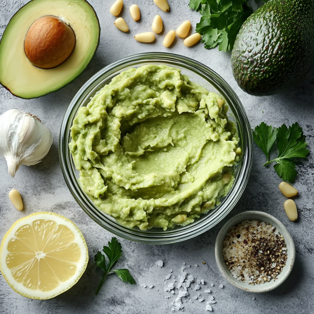 Авокадо 2 шт.; Орешки кедровые 50 г.; Масло оливковое 30 г.; Лимон 0.5 шт.; Соль по вкусу; Перец черный молотый по вкусу; Чеснок 3 зубч.; Петрушка 1 пуч.;