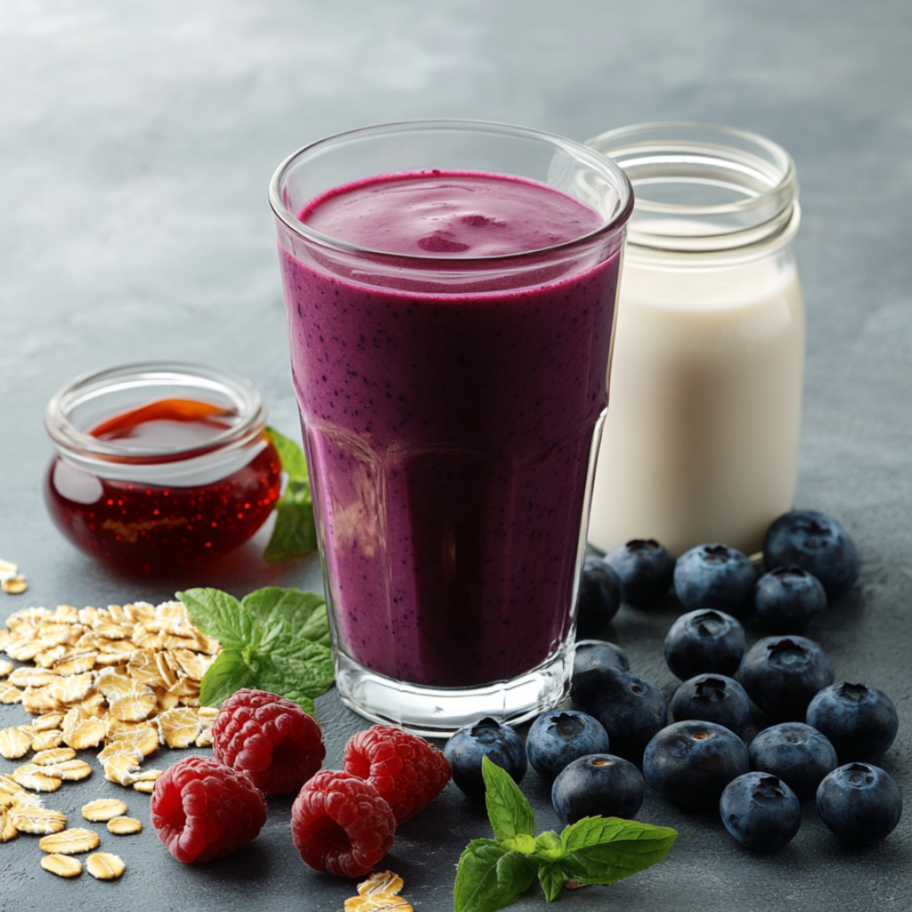 Подготовьте все необходимые ингредиенты Овсяные хлопья залить горячей водой и отправить на 2 минуты в микроволновку на мощности 850 Вт. В готовую кашу добавьте чернику и пюрировать блендером. Залить смесь молоком и снова взбить. Чтобы сделать смузи более сладким, можно добавить мёд, ягодный сироп или варенье.