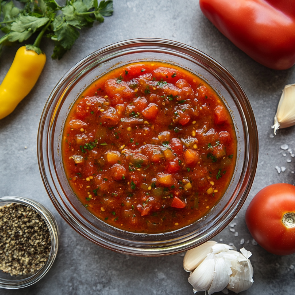 Помидоры 1,25кг; Болгарский перец 125гр; Лук репчатый 50гр.; Чеснок 50гр; Поваренная соль 0,4 ст.л; Сахар 100гр; Растительное масло 38мл; Уксус 38мл; Перец молотый 0,3 ч.л;