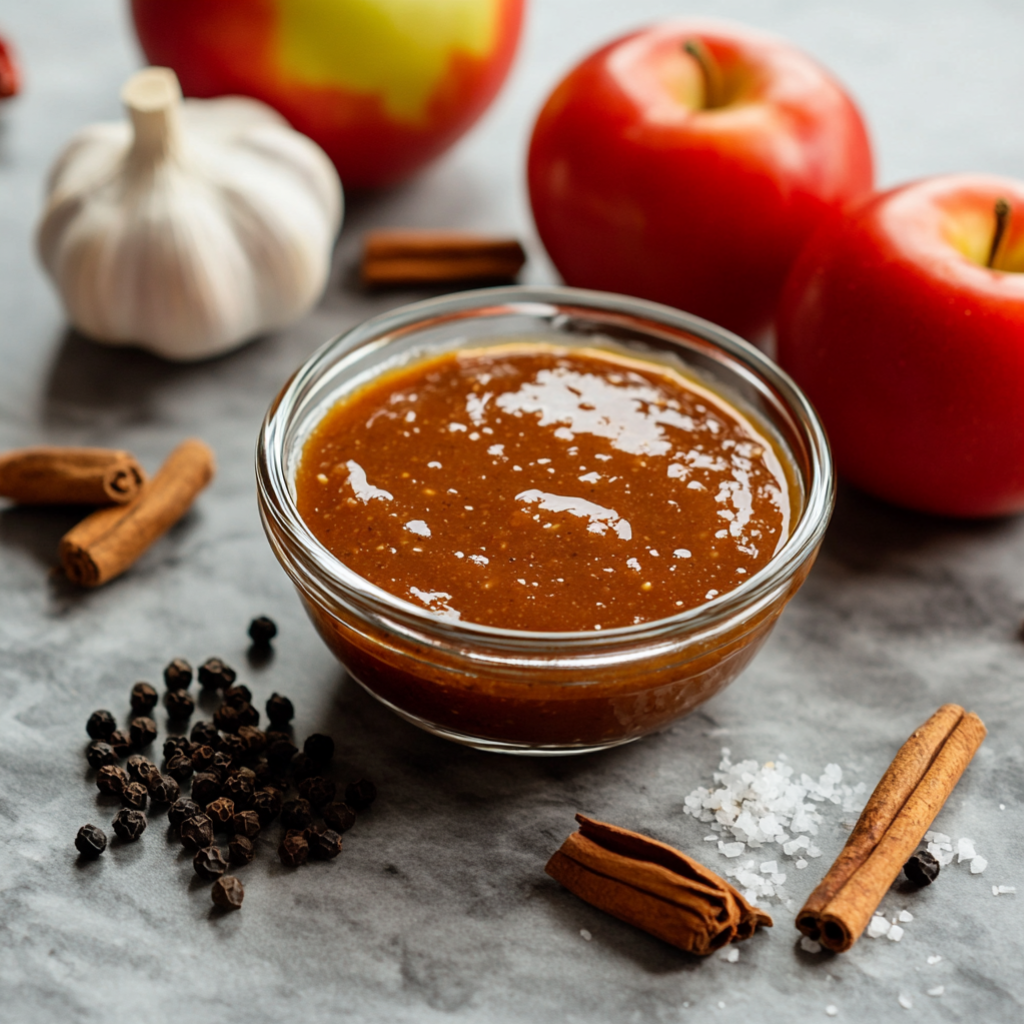 Помидоры 800гр.; Яблоки 300гр.; Вода 4ст.л.; Перец черный молотый 0.5ч.л.; Гвоздика 3шт.; Душистый перец 10шт.; Корица 0.33ч.л.; Мускатный орех 0.33ч.л.; Соль 0.5ч.л.; Сахар 1ч.л.; Уксус (9%) 1.5ст.л.; Чеснок 3 зубч.;