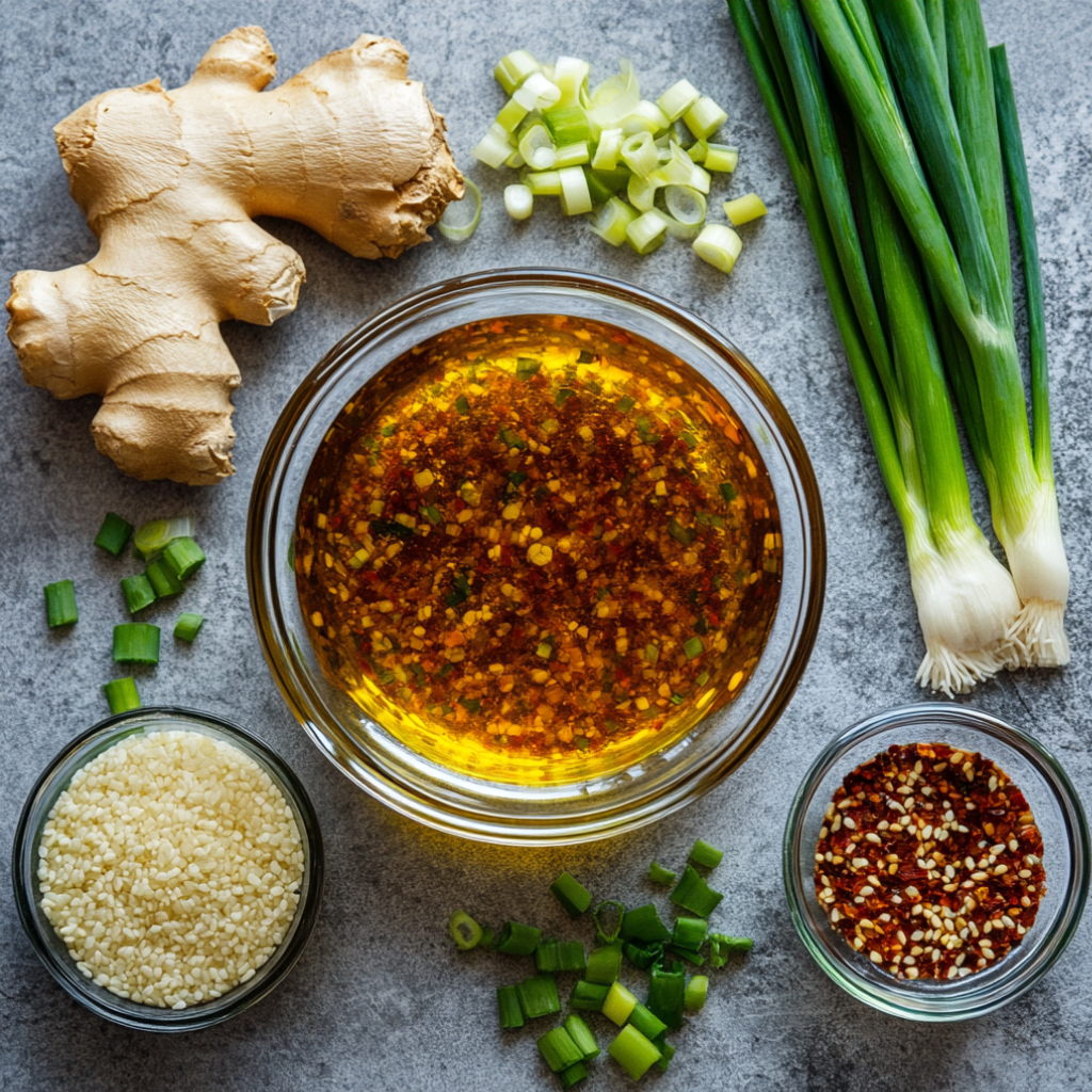 Кунжутное масло 1ч.л; Подсолнечное масло 30гр.; Имбирь 1ч.л.; Зелёный лук 30гр.; Сахар 1ч.л; Соевый соус 25мл; Рисовый уксус 1,5 ст.л; Соль по вкусу;