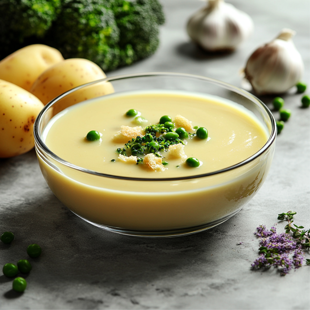 Бульон (или вода) 1л; Картофель 2 шт.; Морковь 1шт.;Лук 1шт.; Брокколи 100гр; Зелёный горошек 100гр; Чеснок 1зубч.; Сливки (любой жирности) 150мл; Соль по вкусу; Специи сухие по вкусу;